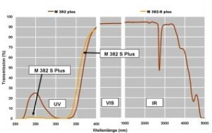 M 382 Plus is a cerium doped fused quartz without trans- mission below 382nm – blocking UV light. It is typically used in applications in which high surface quality, good homogeneity and low bubble content are required.